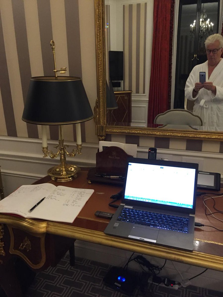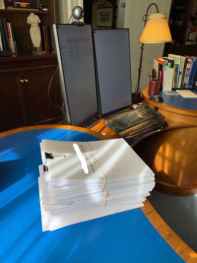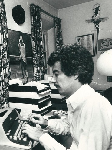 Estudio de Ken Follet en los años ochenta. Llama la atención la variopinta decoración, en la que encontramos desde un sugerente poster de una tenista, pasando por un emblema nazi, en consonancia con la temática de muchas de sus novelas y un reloj de pared.